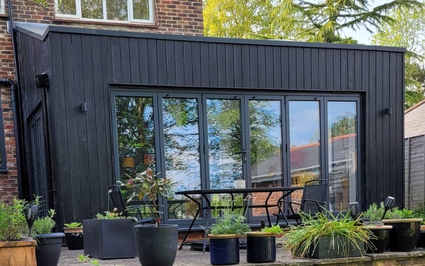 A semi-detached property in an attractive village. The house had a tired small kitchen and extension which the client wanted to replace. The project presented a challenge with a sloping site and level changes which were designed into the new extension layout. Rooflights in the extension allow light into the new bespoke kitchen, which has a dramatic position looking down into the new rear extension sitting room. The extension itself has bifolding doors opening out onto the garden and is clad in black vertical timber giving a dramatic finish.